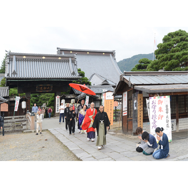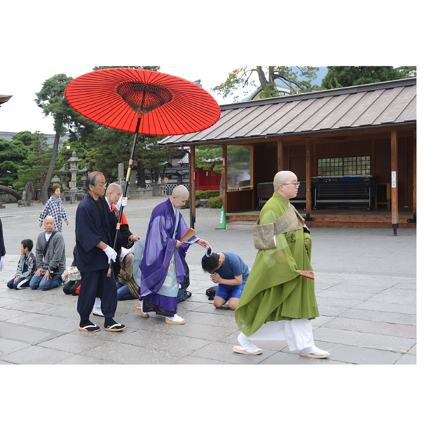 「お朝事」の前後に、法要の導師を務める住職(男性はお貫主さま、女性はお上人さま)が本堂を往復される際に、参道にひざまずく信徒の頭を数珠で撫でて功徳お授けになる「お数珠頂戴」の儀式があるとのこと。