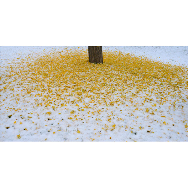 せっかく降った雪、落ち葉となった、黄色いイチョウと雪面を撮ろうと、狙っていたところは、毎朝、年中行われるラジオ体操に来られる方々に踏みつぶされて無残に・・・。