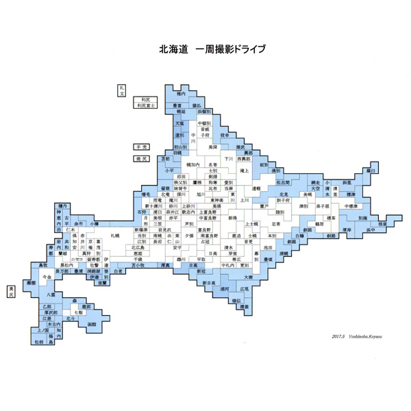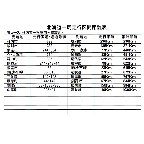 北海道の海岸線一周はどれだけの距離かは、走り方にもよるのでしょうけれど、よく、2500㎞~3000㎞とか言われますが、いつも撮影ドライブを一緒にしている仲間が、道路地図上で距離計算をしてくれて、その結果は、2390㎞でしたので、ここでは、その距離を表示させていただきました(ご参考まで、その表は、画像でアップさせていただきます)。