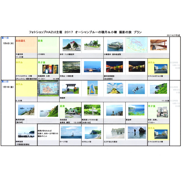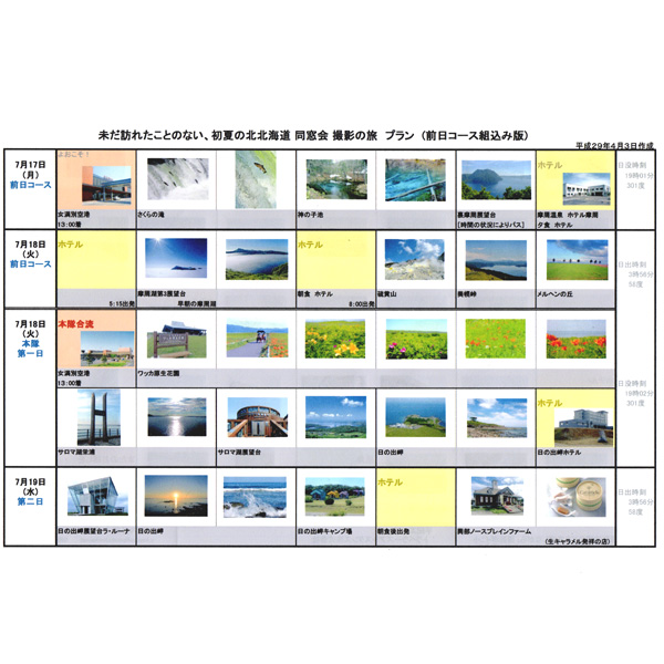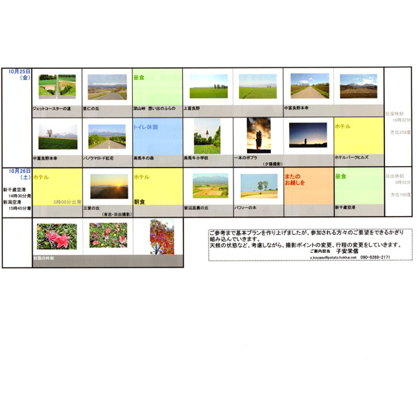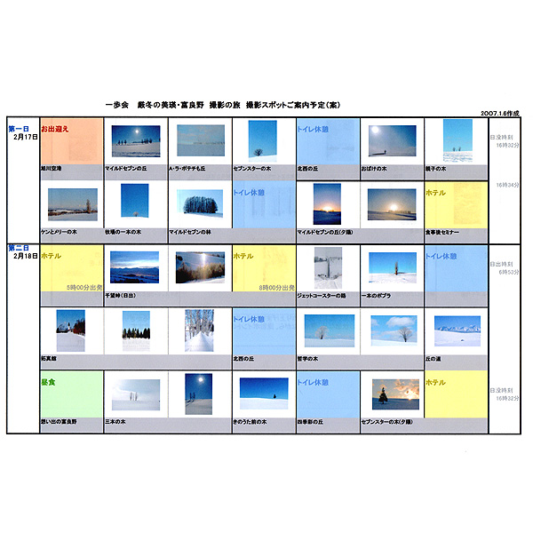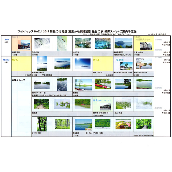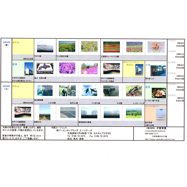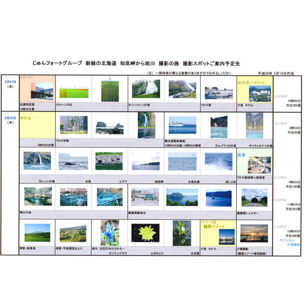 主催者が会員募集をしやすいように撮影予定スポットのご紹介したり、本番では、新たな情報を入手して改訂版を作成し、ご参加者の皆さんにお届けしております(ご参考まで画像をアップしました)。