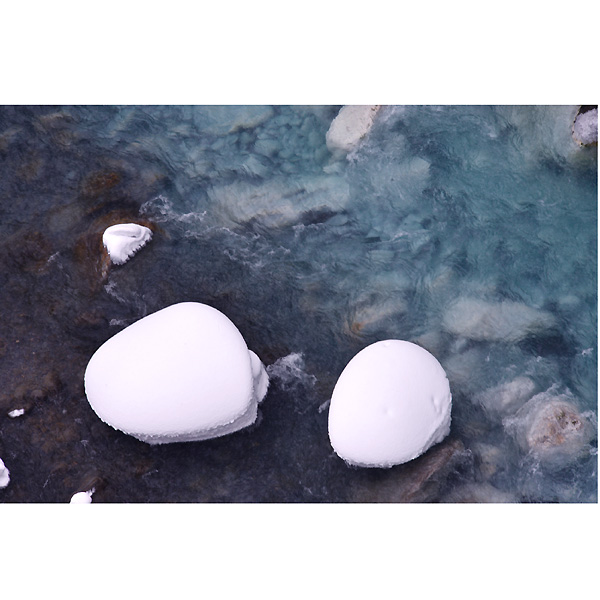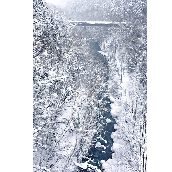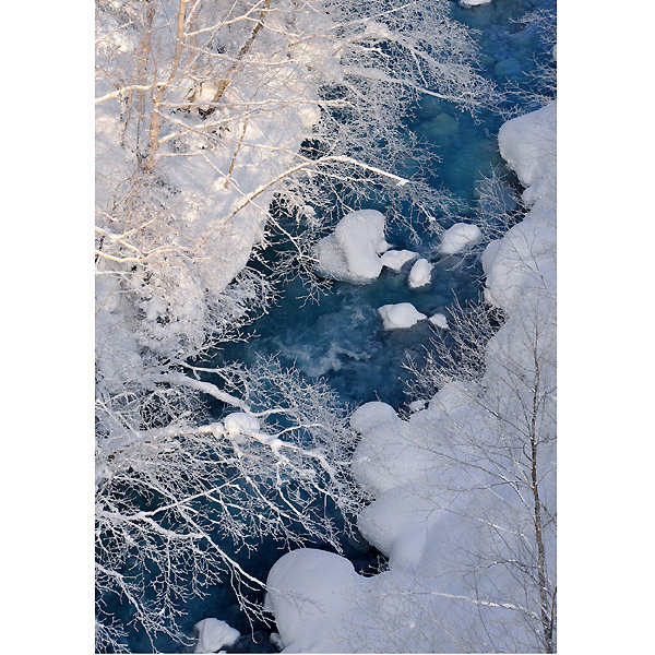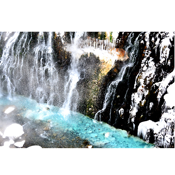 さらに、滝の横から掛け流している白金温泉水が、光の散乱を助けるイオウ・石灰成分などが、川底の石・岩を白くし、水の青さをよりいっそう引き立てているとのことですが、真っ白な風景の中でみる白ひげの滝は、また格別の風景と思います。