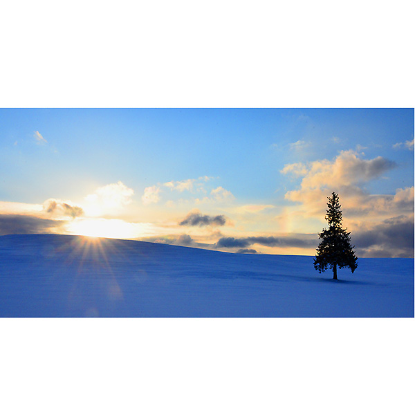 久しぶりに撮影したクリスマスツリーの木と夕陽、ぜんじつ、風が強かったためにできた、風紋ならぬ、雪紋と嵐の5本の木、そして、ブルーリバーにポッカリとうかぶ雪ぼうしの3作としました。