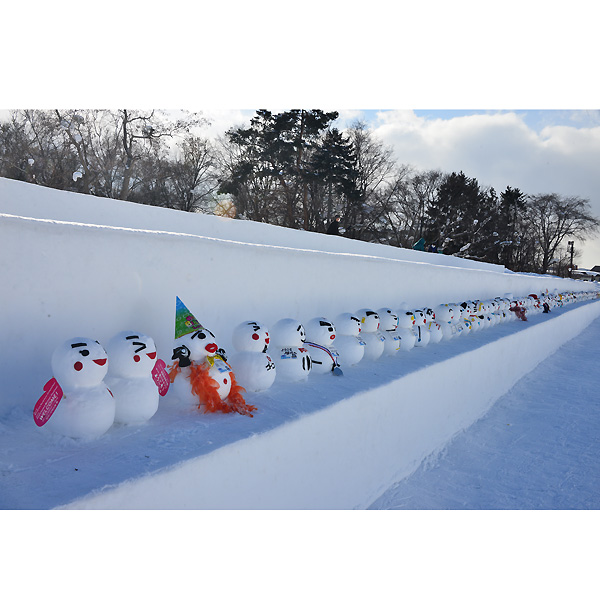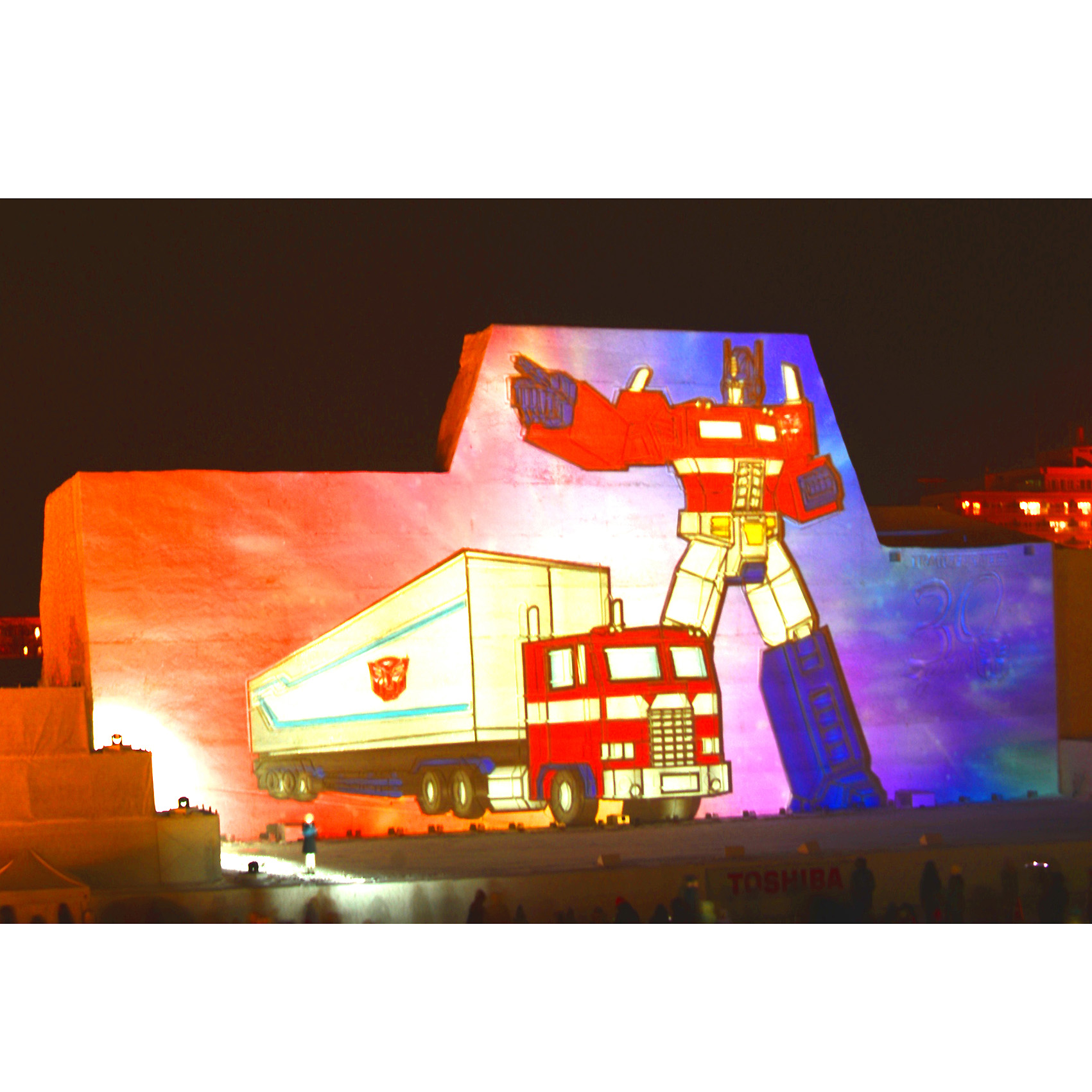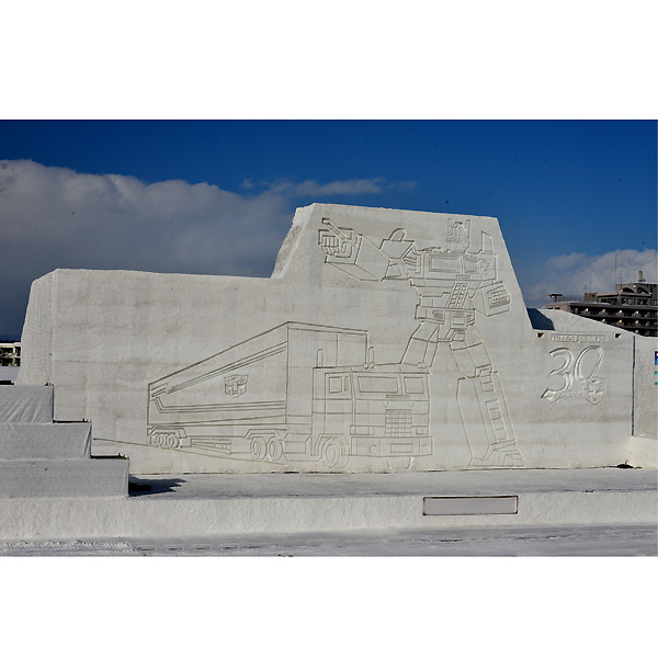 今年の大雪像は、高さ20m 横幅130mとのことで、大雪像からの超ロング滑り台が2本併設され、恒例のひろ~いスノーステージも設けられている。また、今年の大雪像は、例年とは異なり、巨大なスクリーン状の大雪像で、トランスフォーマー30周年を記念した彫り物がされている。 例年とは違う大雪像に戸惑いもあり、その評判は後日出てくるのでしょうね。 作業されている自衛隊の方のお話では、巨大な壁面を平面に作業は、かえって難しい・・とのことでした。 そんな大雪像のためか、例年、三脚を早々と立てて、撮影の準備をするカメラマンが少なく、チョッとさびしい風景となりました。
