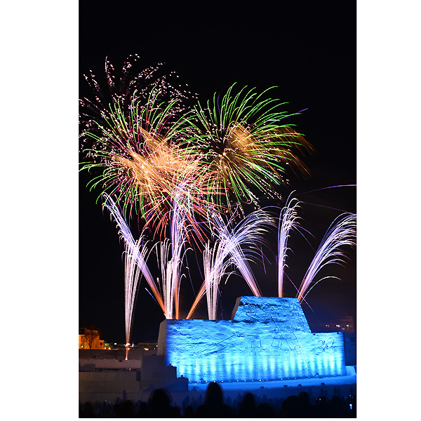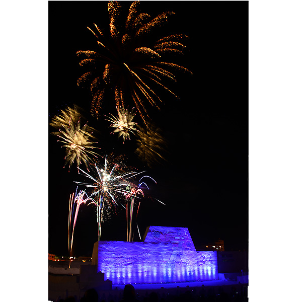この、巨大スクリーン状の大雪像の壁面に、今 はやりのプロジェクションマッピングで、夜の顔を描きだすというのですから、迫力満点ということでしょうね。 オープニングショ―は、プロジェクションマップとレーザー光線、そして大迫力の音のシンフォニーに花火が加わるのですから・・・・