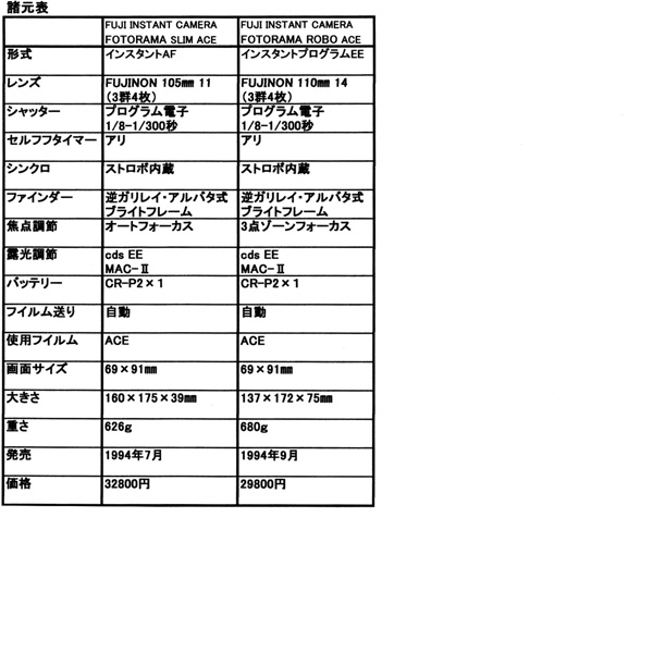 FUJI INSTAN COLOR FILM ACE の発売にあわせ、超薄型(39㎜) 超軽量(626g)のボディに、50㎝までのオートフォーカス機能搭載などの優れた機能を付加し、1994年7月に発売された。