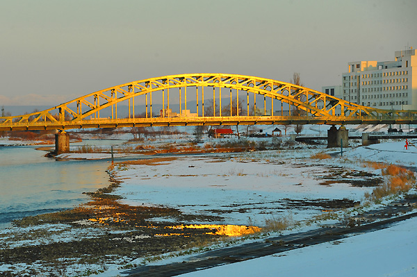 冬場の夕陽がストレートに旭橋を照らし、黄金の橋に変身