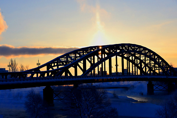 旭橋の真ん中から太陽が昇り始めて、天空に向かってサンピラーが・・