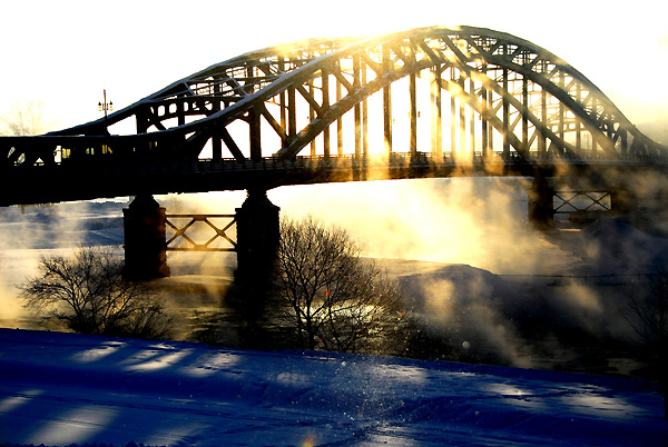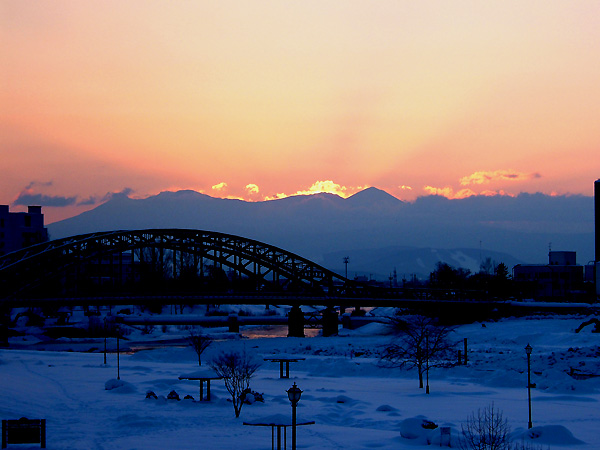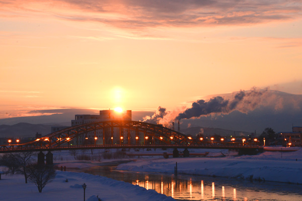 そんななかでの収穫は、「幻日」の出現、「ふたつの太陽」の出現など、思いもよらない現象をみて、ワクワクしながら撮影が出来ました。 当初の目的は、全くと言ってよいくらいはたせませんでしたが、架橋80年を過ぎた旭川のシンボル「旭橋」に、太陽の光によって変化するドラマチックな光彩を加えた画像を集めて紹介致します。