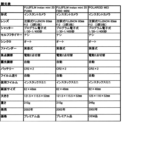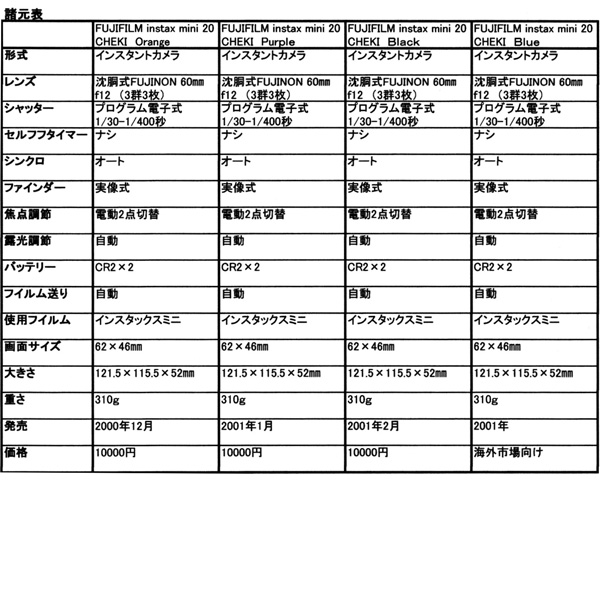 FUJIFILM INSTANT CAMERA INSTAX MINI20 CHEKI シリーズの3番手として、2002年2月に発売された。