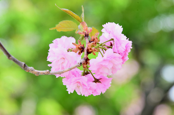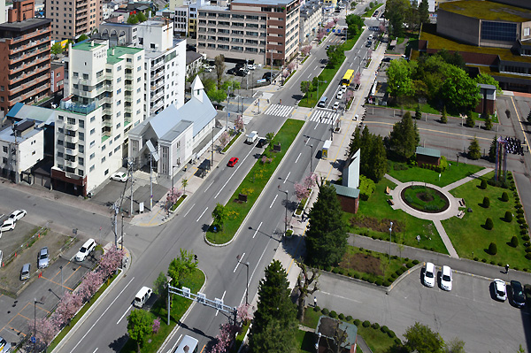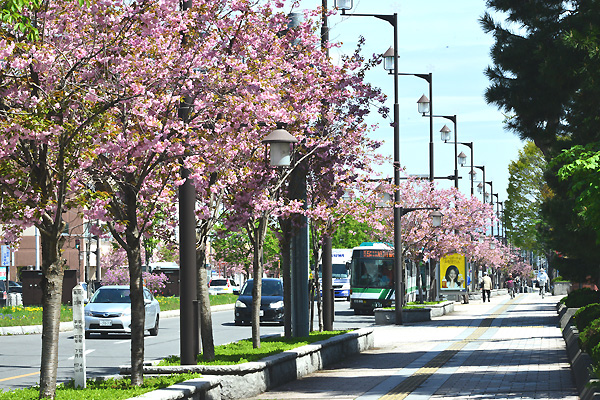 今回は、そんな八重桜を紹介。 旭川駅前からの歩行者天国「会も公園と並行して、旭川市役所・旭川市民会館に通じる緑橋通り。旭川市役所・旭川市民会館あたりの両サイドに八重桜の並木があります。 はたして、いつごろから植えられたのかは、わかりませんが、手入れの行き届いた八重桜並木は、今 丁度 満開。