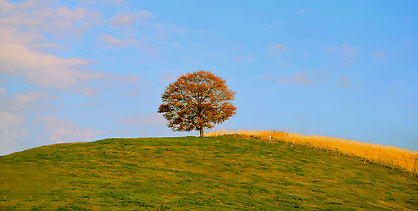 美瑛・美田地区にある小さな円みおびた丘の牧場の上にある1本の木、大好きな撮影ポイントです。 紅葉した木に夕陽が当たった頃がこの時期の最高の被写体と思っております。