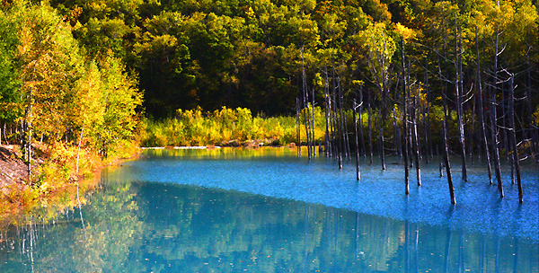 今年の青い池もかつてなような青さが、なかなか見れませんでした。 初めて来られる方々は、青さに感動されるのですが、どうしても、かつての青さが忘れられず、青い池に来るときは、いつも、今日の青さはどうだろうか・・と、ついつい期待してしまうものです。 9月末に、久しぶりに訪れた青い池、期待に近い青さで、ちょっとうれしかったですね。