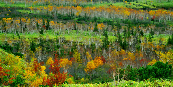 10月中旬くらいまでの黄葉したダケカンバの林は見ごたえがあると思っておりますが、なかなかこれだという撮影スポットには、巡り合えないものです。 撮影のご案内の時は、いつも、白金温泉から吹上温泉に向かう十勝岳スカイラインの途中で駐車スペースが確保できるときに限りご案内をさせていただいております。(観光バスでのご案内の時には、カメラマンの方々には、下車していただいて、撮影中は、バスは吹上温泉で待機していただく形をとっております。)