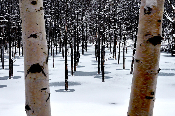 そのころは立ち枯れた木々といえども、幹の部分はなかなか趣のあった風情でしたが、冬場に餌を求めてやってくるエゾシカが枝葉を食べたり、幹の革を剥がして食べたりしたために、今日では真っ黒な幹と化してしまいました。