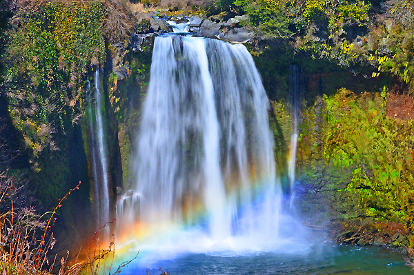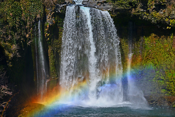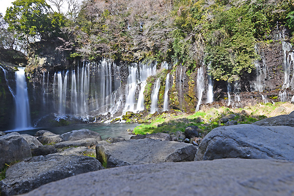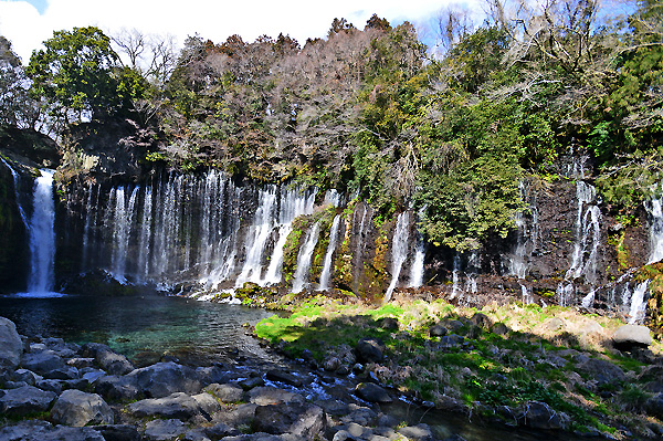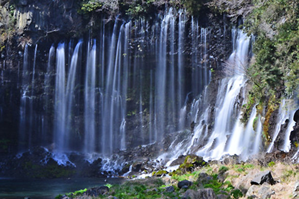 「白糸の滝」は、長い年月をかけて富士山の雪解け水が溶岩断層から、大量に湧き出して滝を形成。 毎秒1.5トンにもなる水が、幅200m、高さ20mの崖を大小数百の滝となって流れ落ちる姿は自然がつくりだした芸術品。