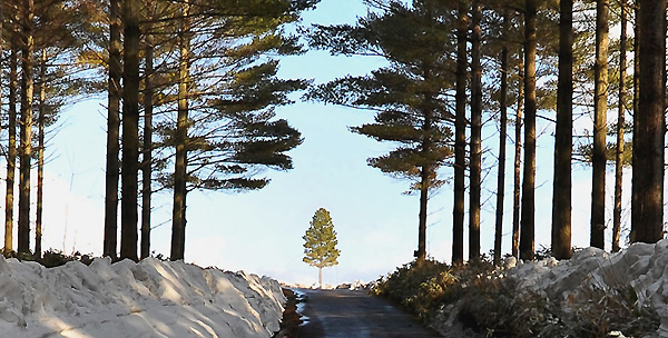 真冬でも緑色の葉を保ち、まっすぐに伸びたスローブ松の林から望む「開拓の木」は、大好きなスポットである。