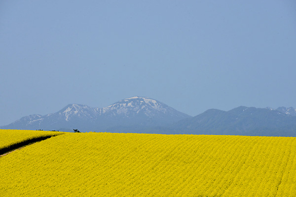 メイン会場の19丁目会場は、広さが10haとのことで、札幌ドーム2個分の広さとか。 さすが広大な菜の花畑に圧倒され、さてさて・・どう撮る?と、一瞬悩んで・・・。 この広大さを表現するのは、なかなか難しい。