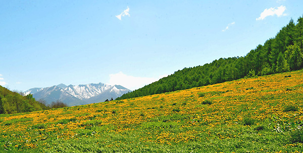 本幸に向かう途中、映画の中に1シーンのような、残雪を山々と、タンポポが咲き乱れたお花畑は、圧巻。