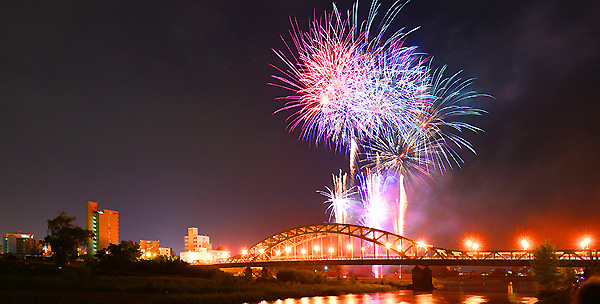 旭川を象徴する橋「旭橋」をいれての花火は、至難の業、昨年は、石狩川の護岸工事が入ったこともあり、例年とは違って、反対側からの花火の打ち上げが決まり、このチャンスを逃しては・・との思いで、何度、撮影スポット探しをしたことか・・。