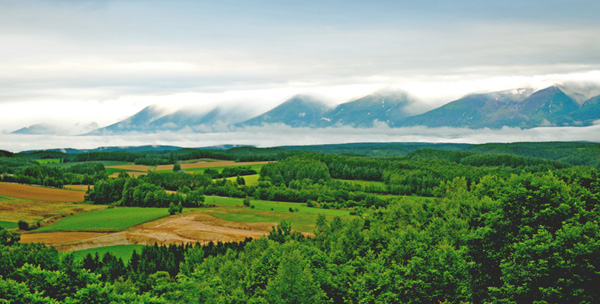 早朝のどんよりした雲に覆われた十勝岳連峰、今日の撮影はどんなものかと気にしながら、富良野方面に車を走らせ、深山峠手前あたりから雲が切れはじめ、ちょっと期待しながら、国道沿いの深山園の駐車場に車を止めてしばらくの間待機し、撮影のチャンスを待った。