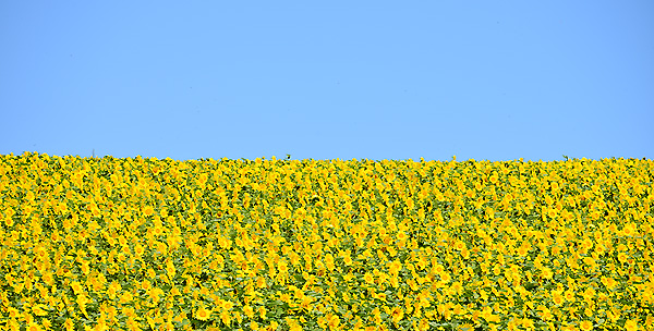 真っ青な空とひまわり畑の黄色を半々にして撮ってみました。