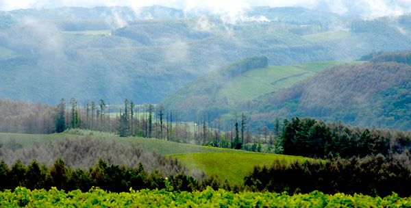 一面霧でおおわれて見えなかった風景も、雲が薄くなり、朝陽までは見えないものの、明るさが増すごとに、少しずつ表れてくる丘の風景もなかなか良いものです。