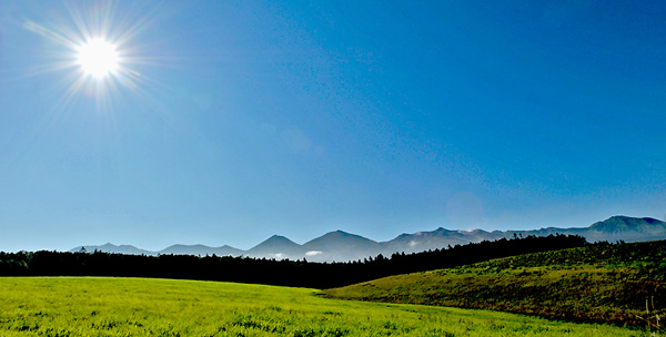 美瑛市街から見ていると、雲に阻まれて 山々は見えなかったが、美郷不動尊を過ぎたあたりからは、雲もなくきれいに十勝岳連峰の山々はきれいに見えて・・。これならば・・との気持ちで、一気に白金模範牧場のいつものスポットへ。 かろうじて、大好きな太陽も入り、ほくそ笑んでみたり・・・。