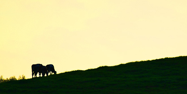 見つけた場所が、日の出前の牧場の一本の木付近。丁度、空が明かるくなり、シルエットで浮かび上がった3頭の牛。