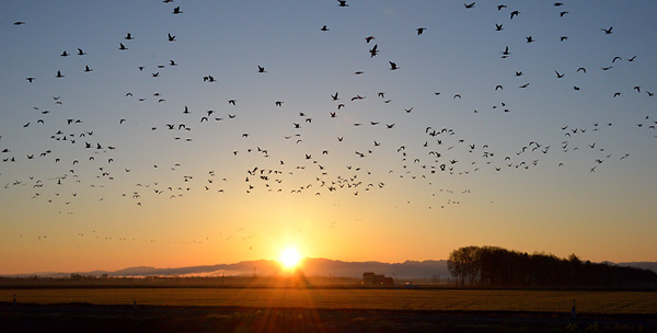 毎朝、日の出とともに餌を求めて、一斉に飛び立つ「ねぐら立ち」をはじめて撮影しました。