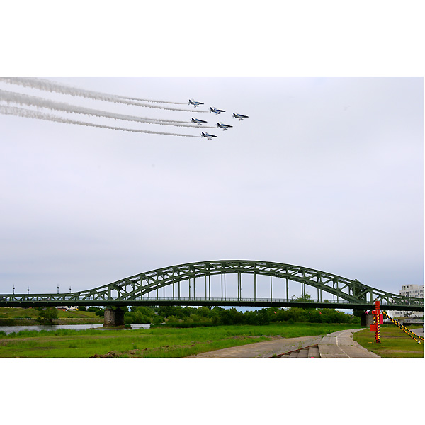 本番は、仲間とともに、旭橋のたもと石狩川河川敷で待つこと、約1時間。 あいにくの曇り空のためか、予定の10分遅れで、1機だけ飛来。 あれれ!天候不順で、とりあえず「1機だけでごめんなさい」なのかなと、話していたら、数分後に6機が飛来。 とりあえずは、RAW機能を外して、JPEG連射モードで撮影。
