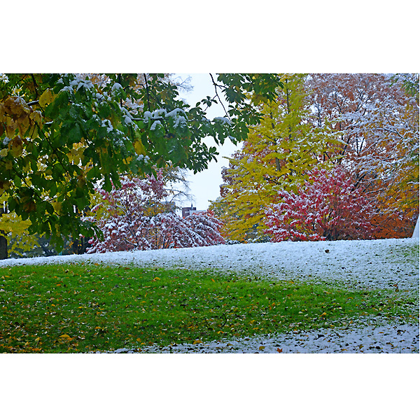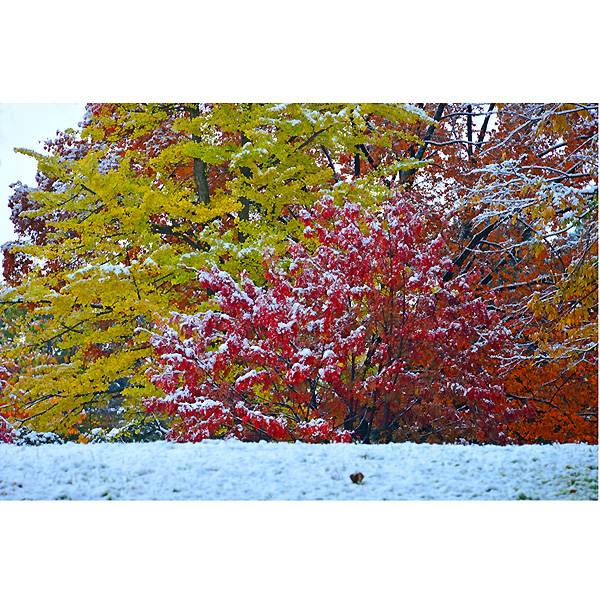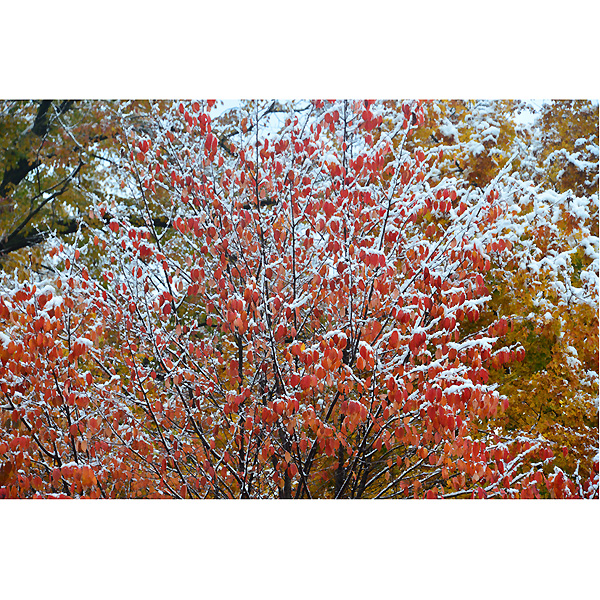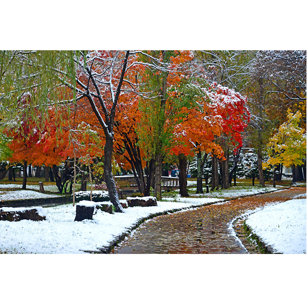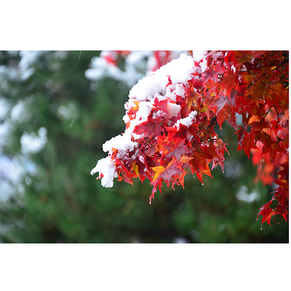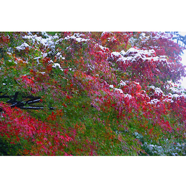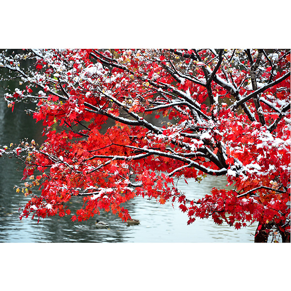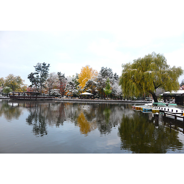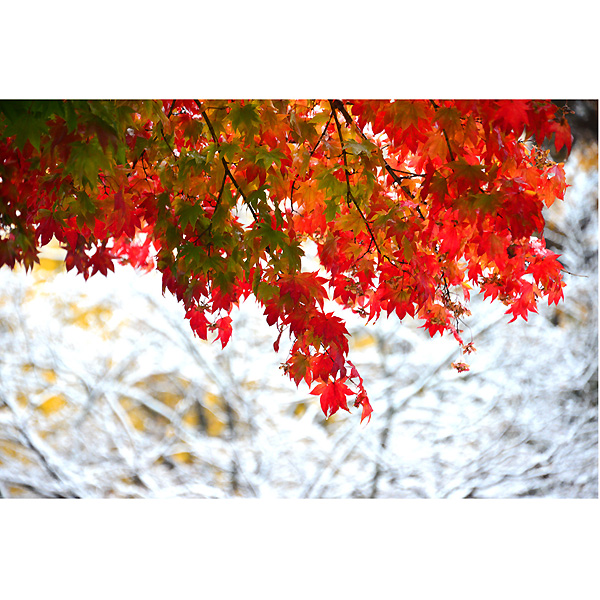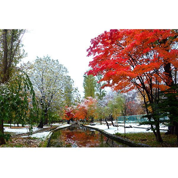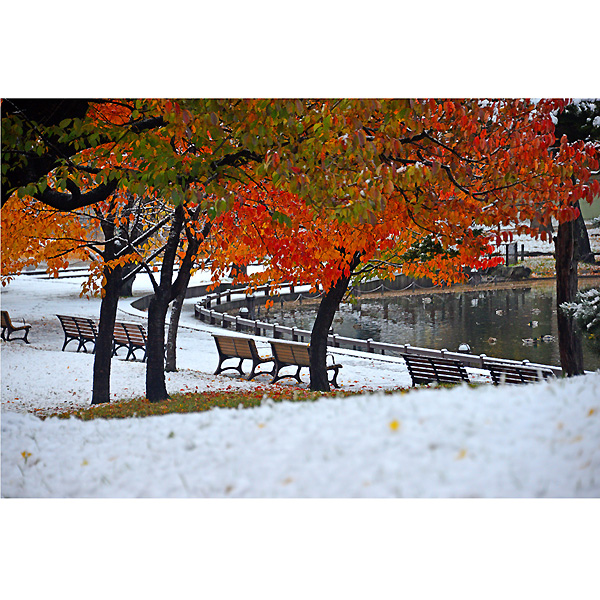 初雪の翌日10月20日は、ダイレクトに常磐公園に向かい、ラジオ体操の音楽を聞きながらしゃがみこんでは、雪と紅葉に夢中になってシャッターを切りました。