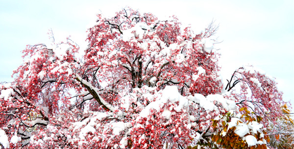 赤い実をつけた大きな木。雪をかぶって、遠くから見ると、ピンク色にみえて、不思議な木が現れた・・といった感じ。