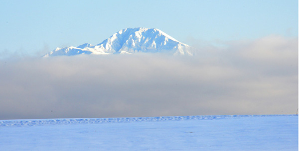 拓真館裏側の「丘の路」から、十勝岳連峰を眺めたものの山々は見えず・・・。しばらくの間、ほかを撮影していて振り向いたら、雲が下がり、真っ白な雪をかぶった十勝岳連峰の頂が一瞬みえ、もう少しもう少しと思ったら、雲が上がって見えなくなったりとすることを何度か繰り返して・・。
