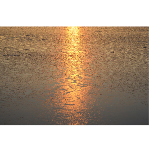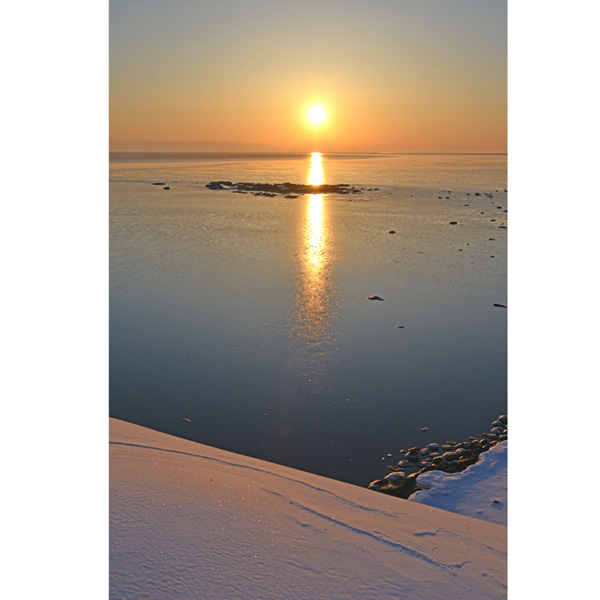 日の出1時間前には、日出岬に到着し、早速撮影の準備。 案の定、流氷はなく、湾内は一面氷がはって・・・。