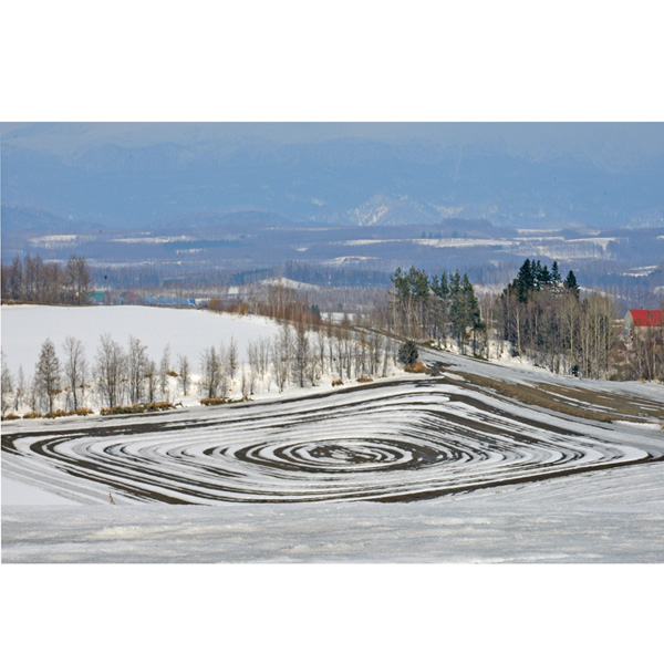 小さくても1ha(3000坪)はある、広大な雪原に描かれた融雪剤を撒いた後の模様は、迫力があるものだと感心したり・・・。 今まで気が付かなかった光景に見とれてしまった。