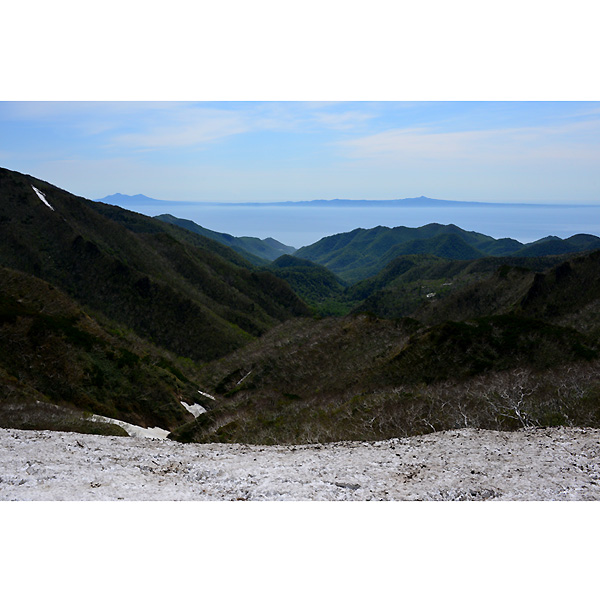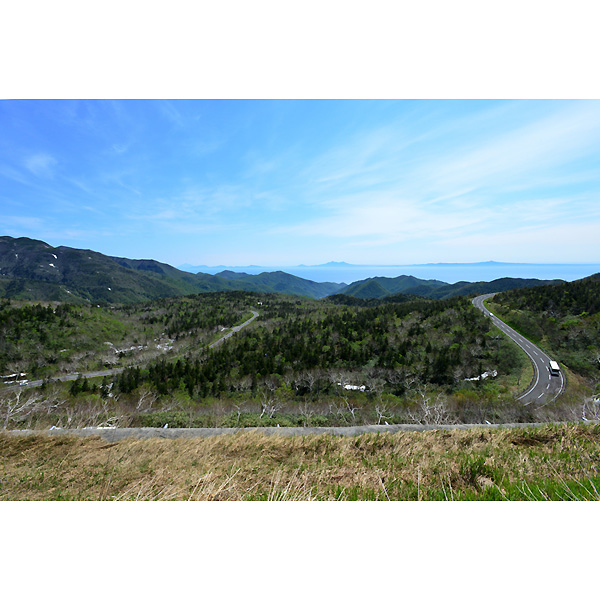知床峠展望台からは、残雪の先に北方領土の国後島がきれいにみえた。