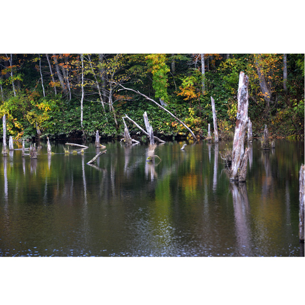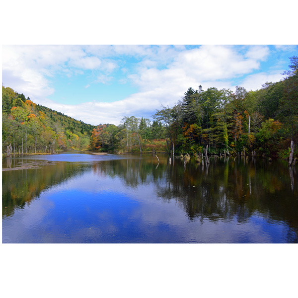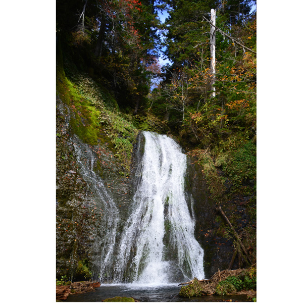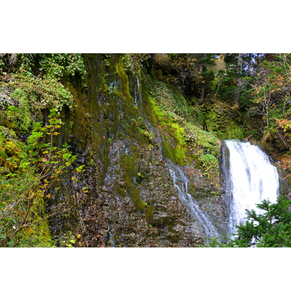 うっそうと茂る林の中に開けた男鹿の滝、上流には、川のない滝とのことで、斜里岳から滲み出た水が、1日に30000トンも湧き出してくるとのことです。